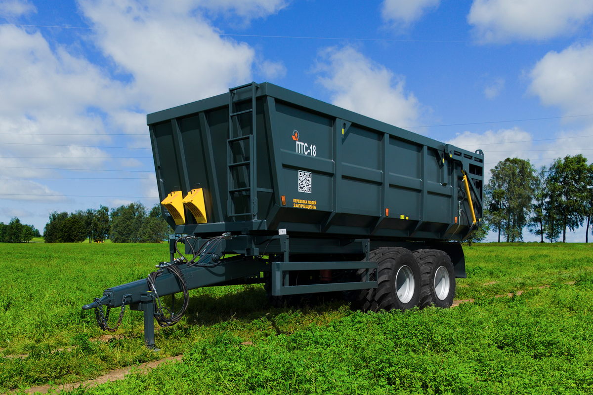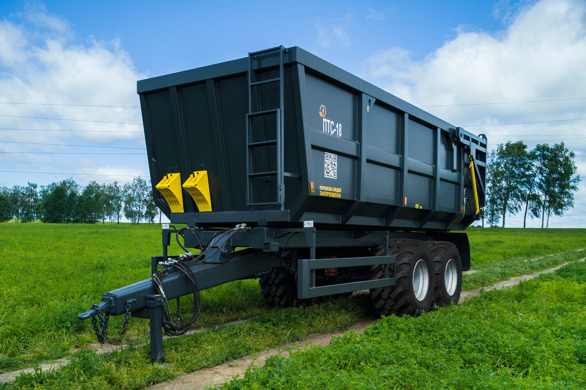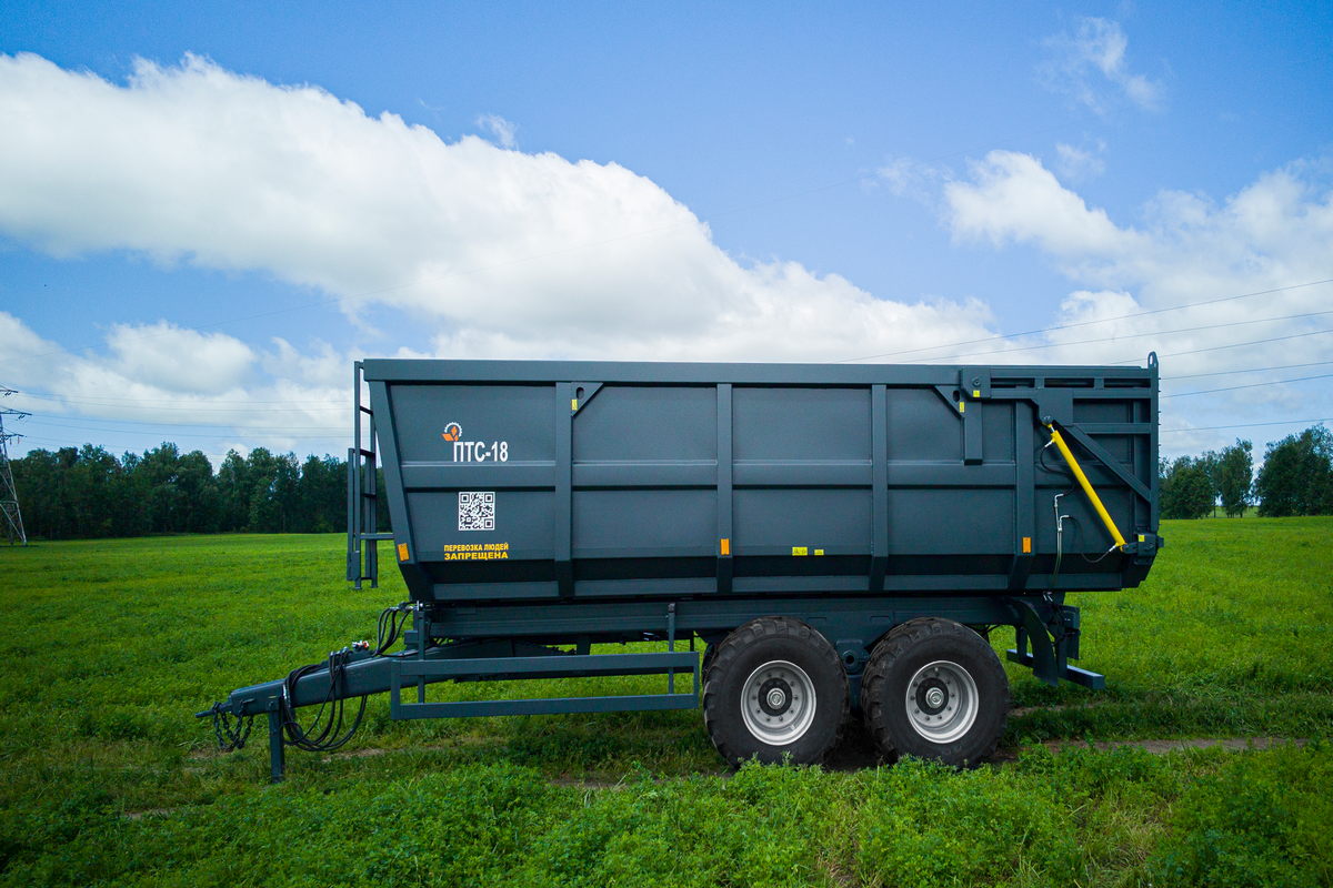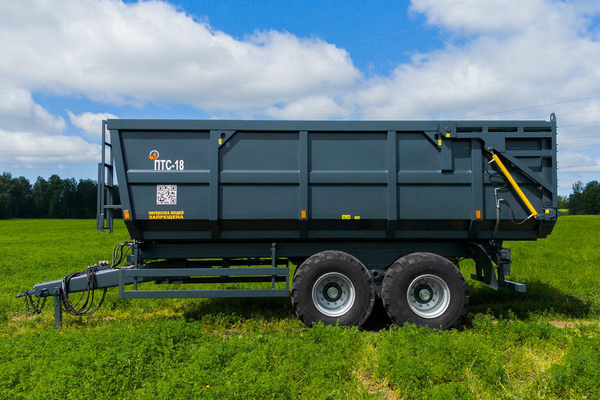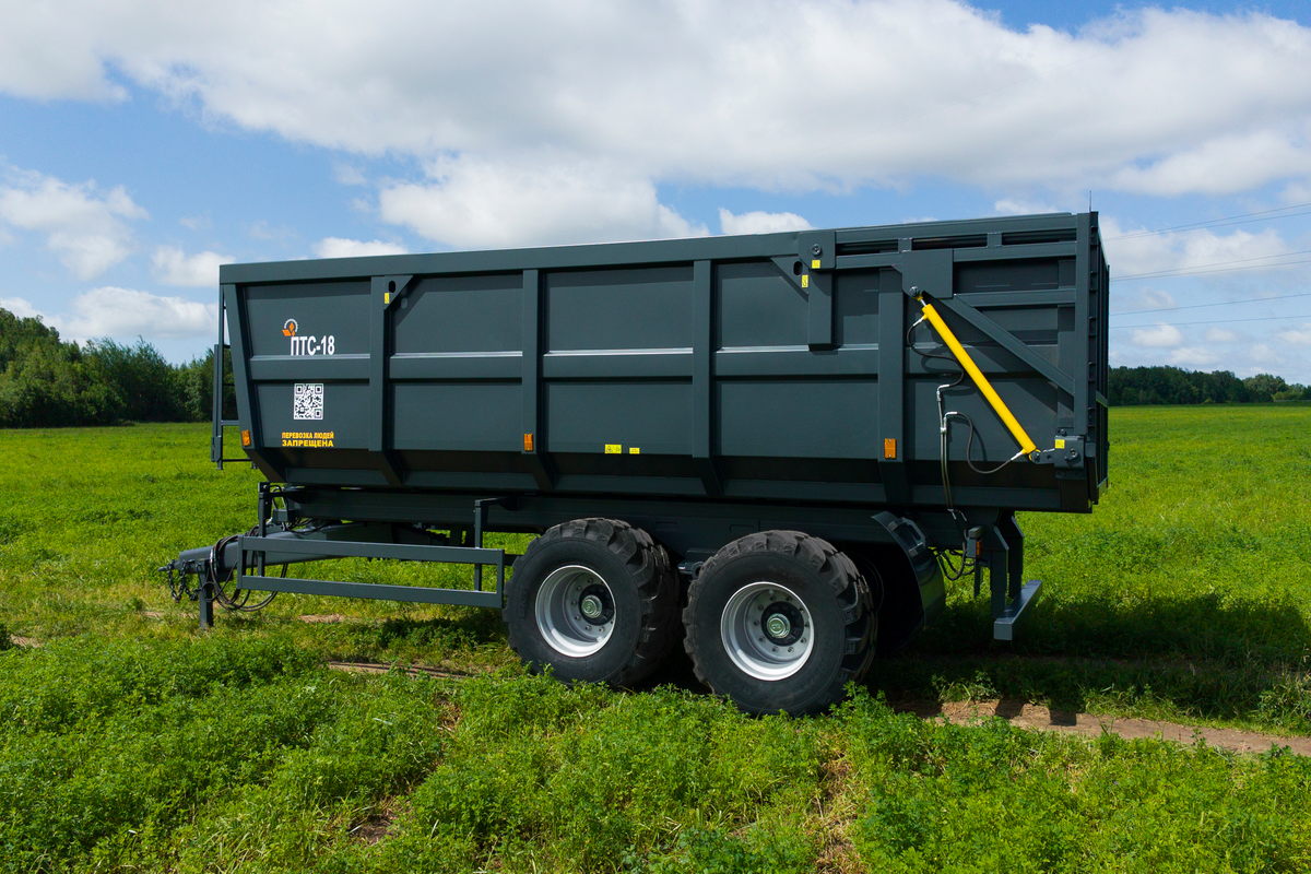 Полуприцеп тракторный ПТС-18- это унифицированный полуприцеп повышенной грузоподъемности для перевозки различных сельскохозяйственных грузов и строительных материалов по всем видам дорог. Полуприцеп тракторный самосвальный ПТС-18 предназначен для транспортировки различных сельскохозяйственных грузов, зерна, корнеплодов, органических удобрений, строительных материалов и других грузов с выгрузкой назад.  ПТС-18-1 укомплектован дополнительными надставными бортами высотой 500 мм.
